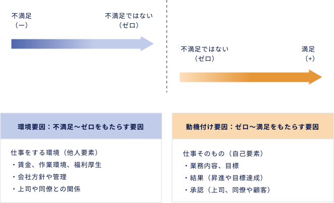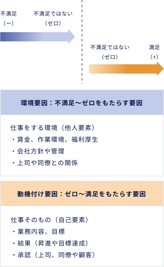 3.ハーツバーグ理論:満足/不満足に連続性はない。「動機づけ要因と環境要因」を考えるべきという考察。