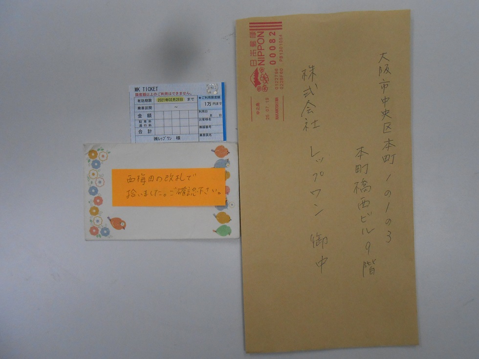 誰かが落とした当社契約のタクシーチケットを拾った粋な方が、善意で郵送してくれた。