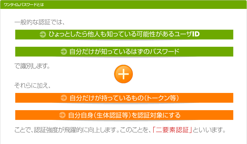 | ソフトウェアトークン | PCやスマートフォン、携帯電話上でワンタイム・パスワードを生成する。PCなどを紛失するとなりすまされる可能性がある。 | パスロジ社のPasslogicなど |