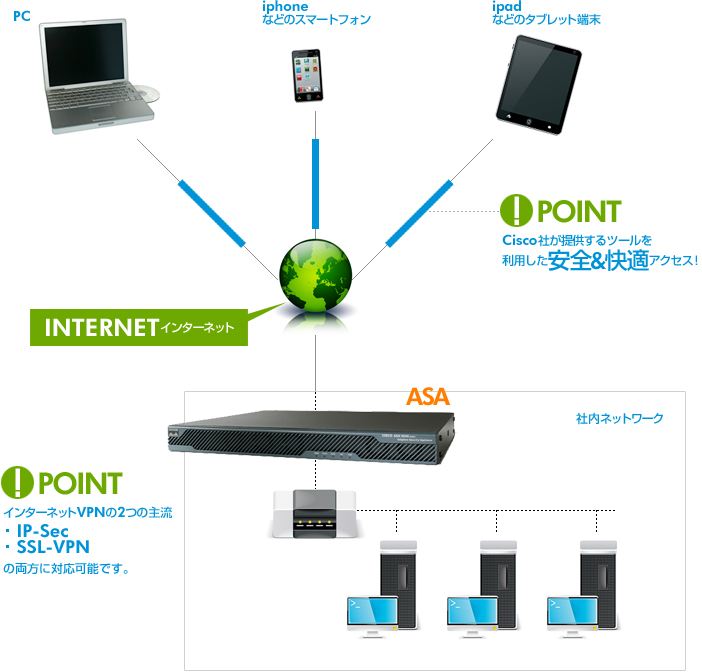 IP-Sec、SSL-VPNを利用してセキュアな接続を確保します。 - ラップトップPC、ipadなどのタブレット型端末からアクセスしたい!